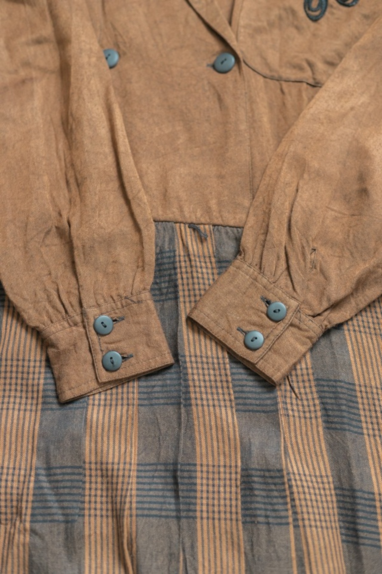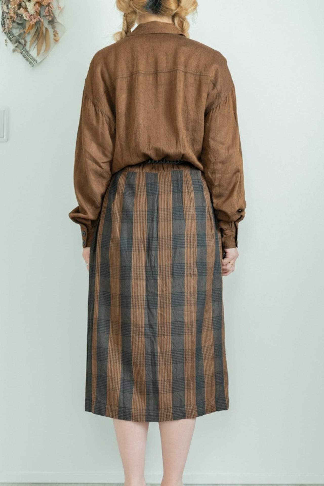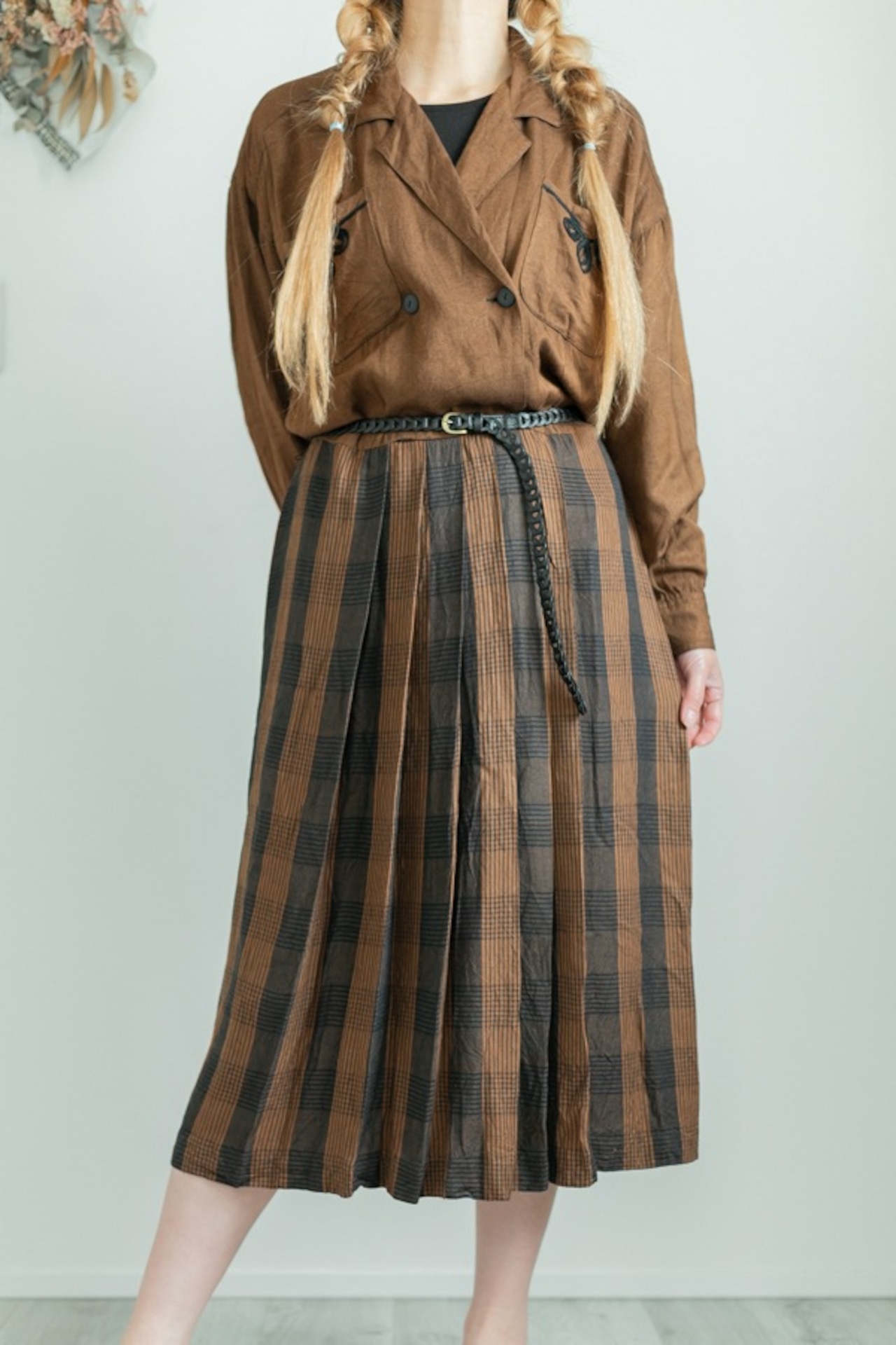 チェック柄 プリーツスカート ステッチ刺繍 オープンカラー
